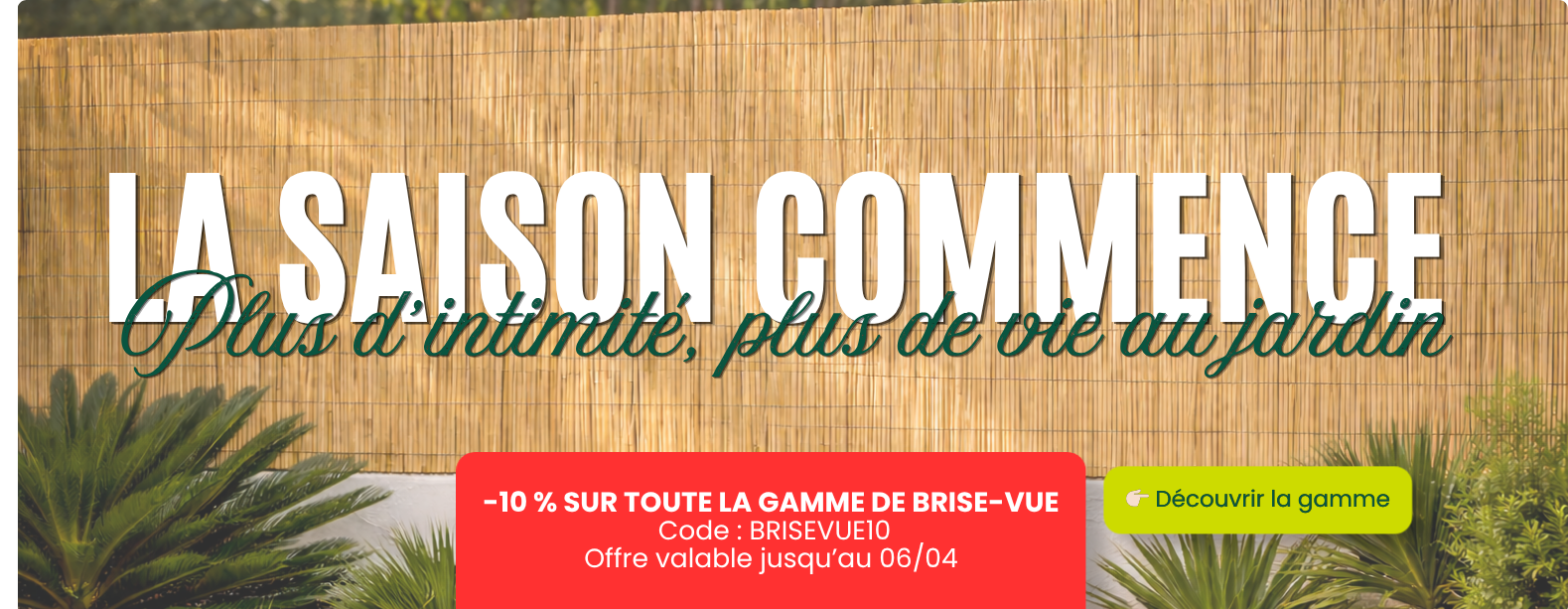 Trouvez tous les produits pour aménager et décorer votre jardin, terrasse ou balcon : brise-vues naturels ou synthétiques, gazon artificiel, panneaux décoratifs extérieurs, murs végétaux, accessoires de pose, ainsi que des solutions pour le semis et la protection des plantes.